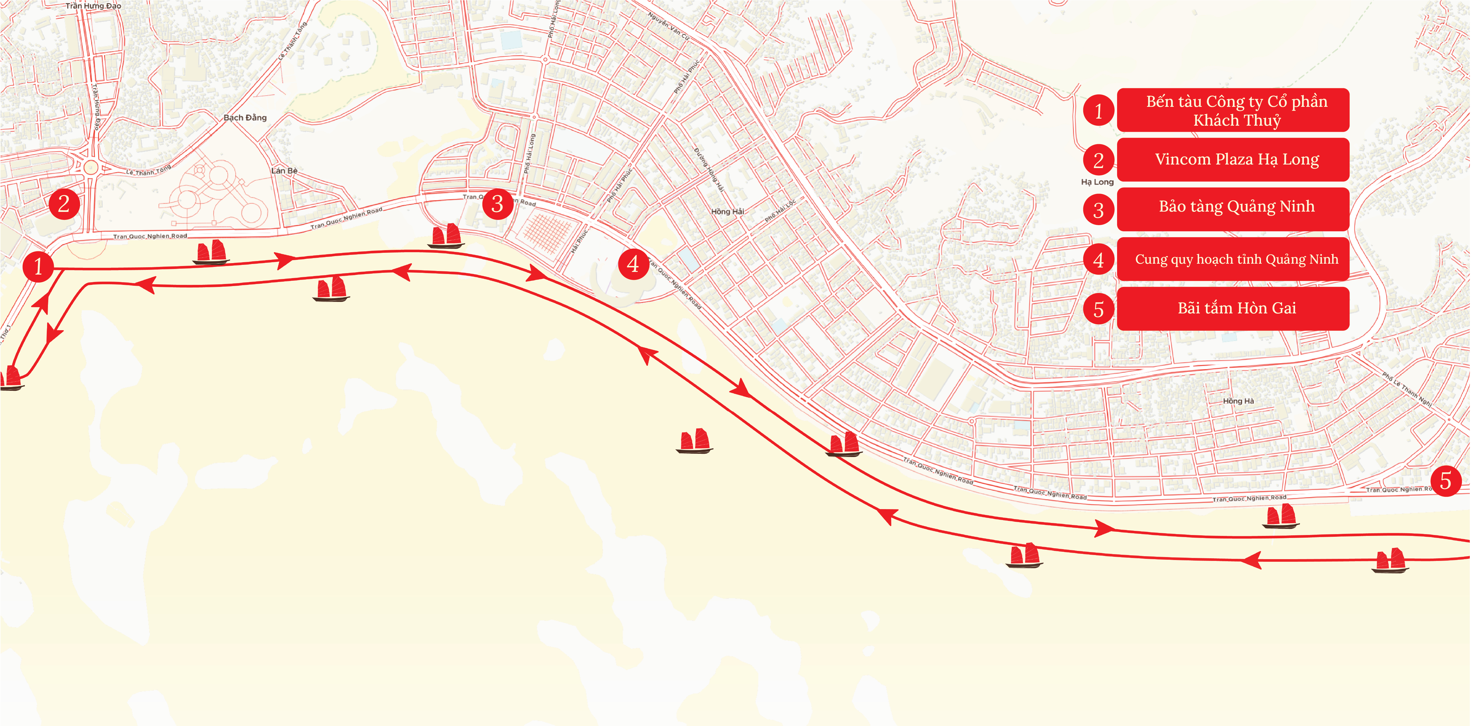 Chạy ven bờ (1 vòng), xuất phát từ bến khách Thủy đi ven bờ → Cầu Bài Thơ → Vincom Hạ Long → Bảo tàng & thư viện Quảng Ninh → Cung quy hoạch Tỉnh → Bãi tắm cọc 5 → bến khách Thủy. Thời gian hải trình: 60 phút/chuyến.